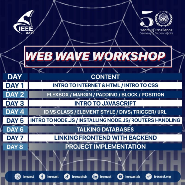 The WebWave Workshop is a free, developer-bootcamp style event organized by the IEEE AAST Alexandria Student Branch at AASTMT. It focuses on enhancing participants’ web development skills through hands-on sessions. The workshop spans multiple days, offering both front-end and back-end learning experiences. It targets students and aspiring developers aiming to build practical technical skills. Participants receive an official certificate of completion at the end of the workshop. The event had more than 50 participants.