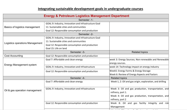 The document is most strongly aligned with SDG 15.2.4, as it demonstrates the integration of biodiversity, ecosystem considerations, and sustainable land-use concepts directly into the academic curriculum across several departments. Courses in transport, logistics, entrepreneurship, energy, and supply chain explicitly incorporate topics such as forest management, desertification, land ecosystem impacts, environmentally responsible operations, and the protection of terrestrial environments. This reflects institutional commitment to embedding biodiversity and land sustainability principles into educational planning and course design.