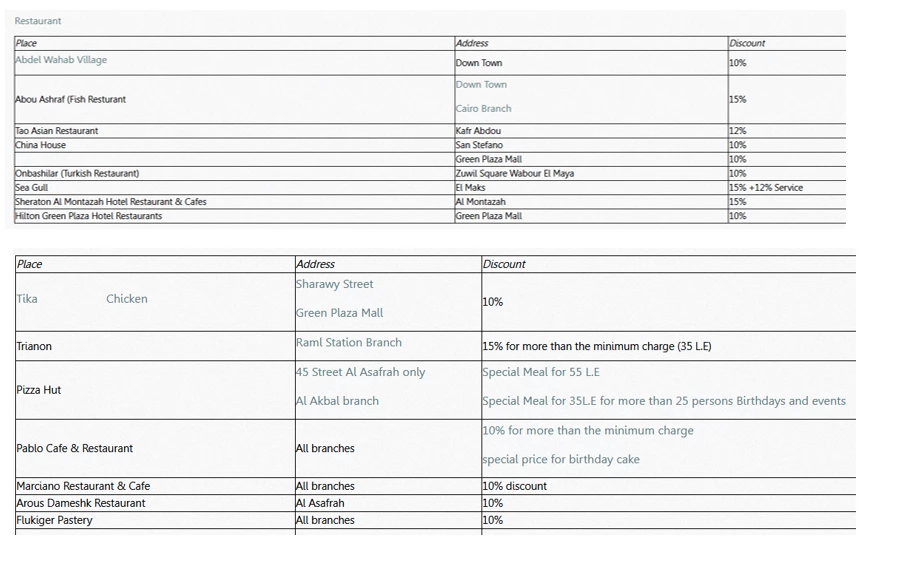 Collaborations with multiple dining partners promote variety, service quality, and offer discounts to staff members inside and outside the campuses as well. Multiple discounts from restaurants across Egypt are offered to staff members upon providing their employability proof, such as Abdel Wahab Grills, Pablo Café and Restaurants, Pizza Hut, and others.