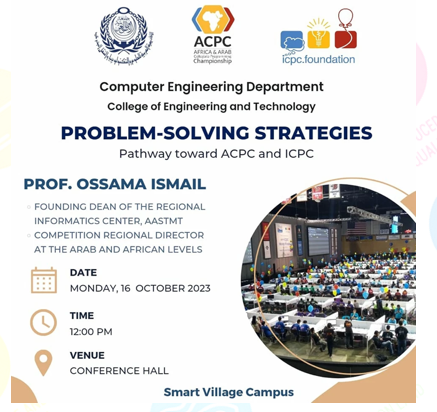 The Computer Engineering Department at the College of Engineering and Technology, AASTMT, organized a session titled “Problem-Solving Strategies: Pathway toward ACPC and ICPC.” The session was delivered by Prof. Ossama Ismail, the Founding Dean of the Regional Informatics Center at AASTMT and Regional Director of the competition at the Arab and African levels. It took place on Monday, October 16, 2023, at 12:00 PM in the Conference Hall, Smart Village Campus. The event aimed to equip students with essential techniques and insights to enhance their problem-solving skills and prepare them for regional and international programming competitions.