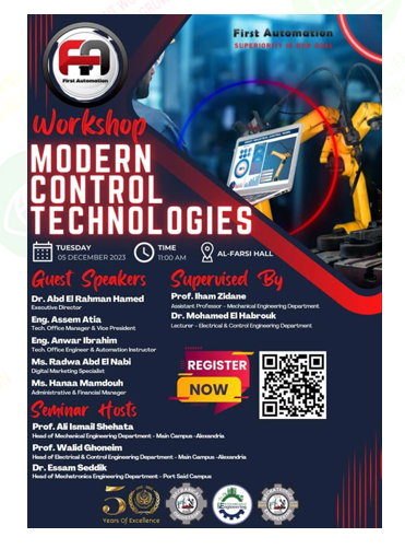 The Department of Mechanical Engineering, in collaboration with the Department of Electrical and Control Engineering at the College of Engineering and Technology, Main Campus, and the Department of Mechanical and Mechatronics Engineering at the Port Said Campus, organized a workshop presented by First Automation Company titled “Modern Control Technologies.”