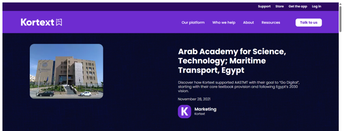 4- Digital Textbook Platform (Kortext & Moodle) - AASTMT partnered with Kortext to deliver ~60,000 e‑textbooks integrated into its LMS for 13 colleges and 8 campuses, enabling offline/online access and reducing the need for physical attendance and printed materials.