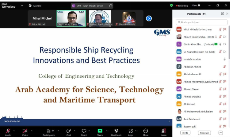The Department of Marine Engineering and Offshore Structures at the College of Engineering and Technology, Arab Academy for Science, Technology and Maritime Transport (AASTMT), organized an online workshop titled “Responsible Ship Recycling – Innovations and Best Practices” in collaboration with Global Marketing Systems Inc. (GMS), one of the world’s largest companies specializing in ship and offshore platform recycling. The session, held on Monday, November 4, 2024, via Zoom, featured presentations by Dr. Anand Hiremath, Chief Sustainability Officer at GMS, and Eng. Kiran Thorat, Trader at GMS Dubai. This initiative reflects AASTMT’s ongoing commitment to promoting sustainable maritime engineering practices and advancing environmental responsibility in the regional and global maritime industry.