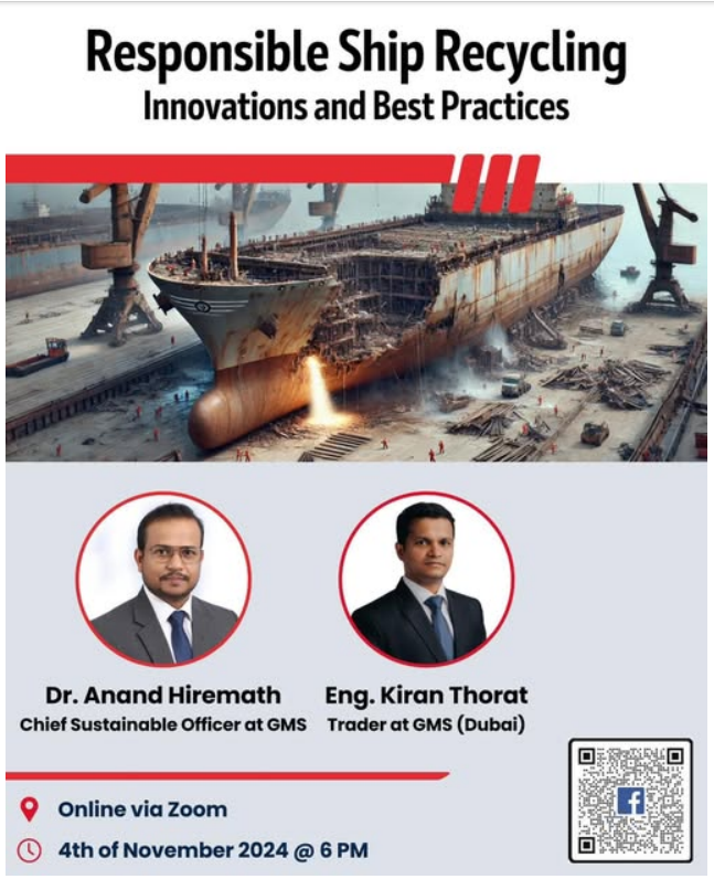 The Department of Marine Engineering and Offshore Structures at the College of Engineering and Technology, Arab Academy for Science, Technology and Maritime Transport (AASTMT), in collaboration with Global Marketing Systems Inc. (GMS) one of the world’s leading companies in ship and offshore platform recycling will hold an online workshop titled “Responsible Ship Recycling – Innovations and Best Practices” on Monday, November 4, 2024, at 6:00 p.m. via Zoom. The session will be delivered by Dr. Anand Hiremath, Chief Sustainability Officer at GMS, and Eng. Kiran Thorat, Trader at GMS Dubai. This event reflects AASTMT’s commitment to enhancing the technical knowledge and professional skills of its Marine Engineering students by exposing them to the latest industrial practices, sustainable innovations, and global career opportunities in the maritime engineering sector.