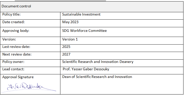 AASTMT is committed to transparency and accountability. We make this policy publicly available on our website and other official platforms. We also publish an annual Sustainability Investment Report, detailing our investment actions and their alignment with our sustainability goals.