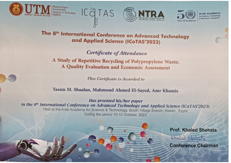 At the 8th International Conference on Advanced Technology and Applied Science (ICaTAS 2023), held at the Arab Academy for Science, Technology and Maritime Transport (AASTMT) – Aswan Campus, Engineer Yassin Shaalan represented the AASTMT Industrial Service Complex in presenting a research paper titled “A Study of Repetitive Recycling of Polypropylene Waste: A Quality Evaluation and Economic Assessment.” The study, co-authored by Engineer Amr Khamis and Prof. Mahmoud Ahmed El-Sayed, was conducted under Research Grant No. 2068, titled “Campus Smart Recycling System to Turn Food Organic Wastes and Recyclables into Economic Value Products.” Funded by AASTMT with a total value of EGP 350,000, the project was implemented by the Research and Development Department between 2021 and 2023, reflecting AASTMT’s strong commitment to promoting sustainable research and practical innovation in waste recycling and circular economy applications.