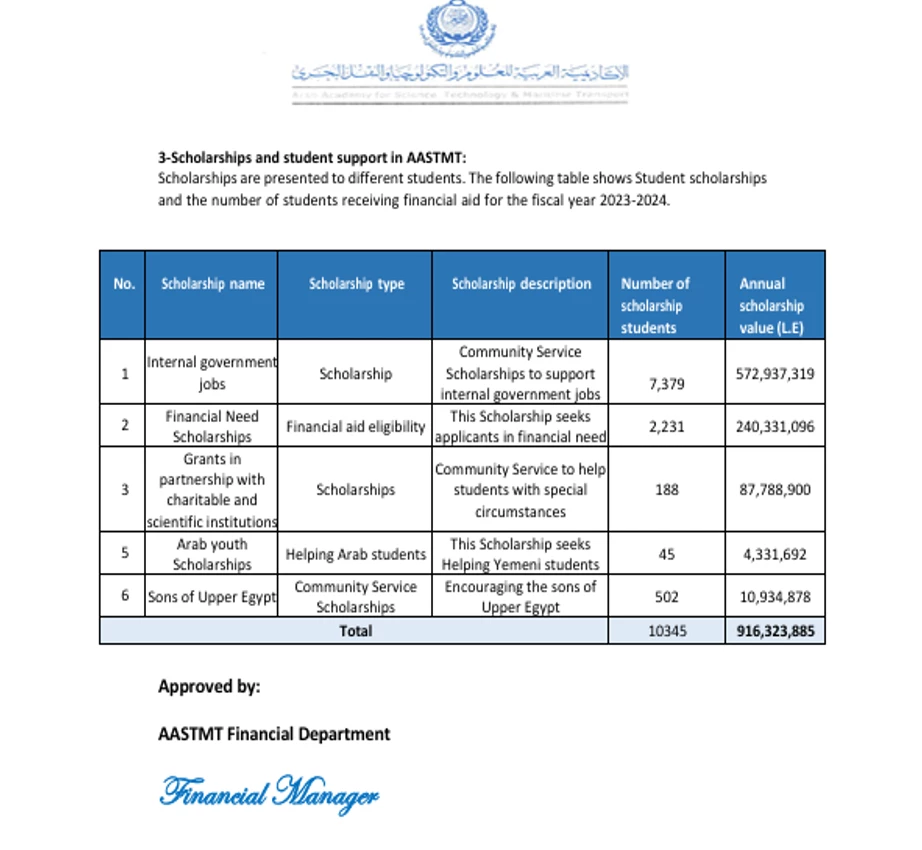 The Arab Academy for Science, Technology, and Maritime Transport (AASTMT)'s Financial Department plays an important role in maintaining the institution's dedication to academic achievement. As an example, tuition fees and discounts are published on the website. Also, Financial aid and students support published on the website.