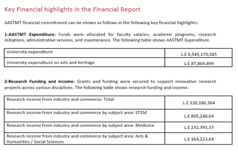Next section shows screen shots sample of the financial report, and it provides an overview of the financial performance during the reporting period 2023-2024. This sample report includes information about research income and total expenses of AASTMT. Through this report, AASTMT aims to ensure transparency and accountability to its’ stakeholders.