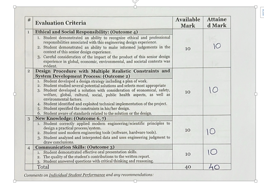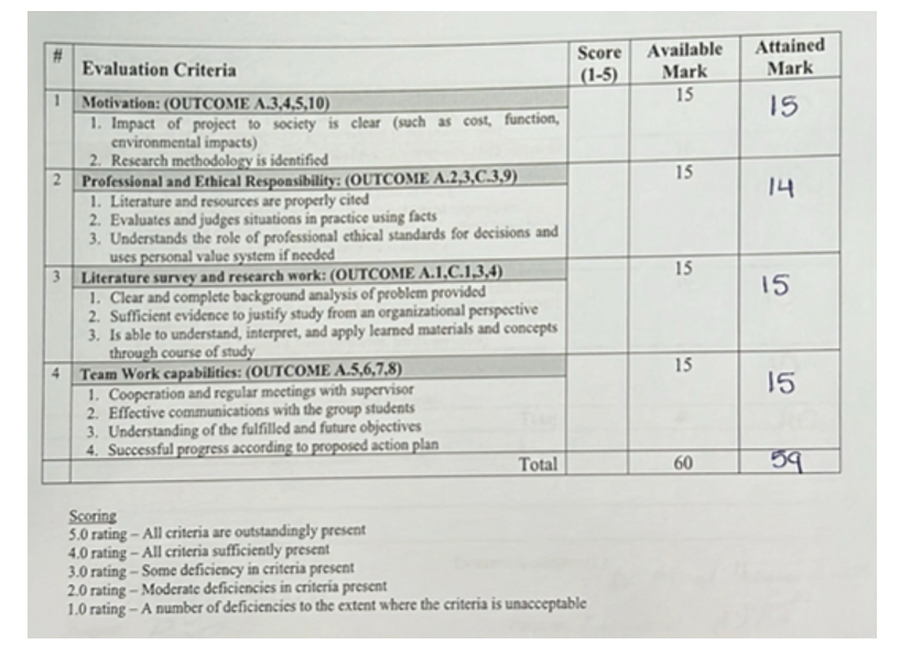 Final-year projects evaluated students’ ability to design engineering solutions with sustainability considerations. The assessments, aligned with ABET accreditation standards, measured students’ understanding of the global, environmental, and societal impacts of their designs.